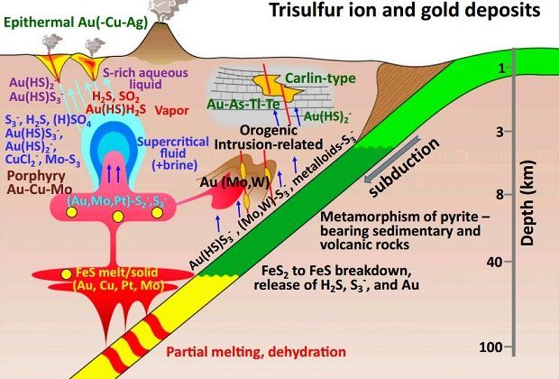 Группа французских ученых смогла объяснить, каким образом формировались месторождения золота с высоким содержанием этого металла. Ключевую роль в этом процессе играют ионы трехатомной серы S3—, которые во много раз эффективнее экстрагирует золото из
